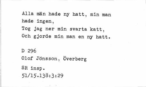 //// Alla män hade ny hatt, min man hade ingen, //// Tog jag ner min svarta katt, Och gjorde min man en ny hatt. //// ! D 296 //// Olof Jönsson, Överberg //// SR insp. 51/15-138:3:29 ////