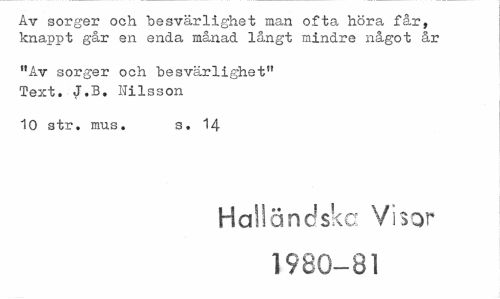 //// Av sorger och besvärlighet man ofta höra får, knappt går en enda månad långt mindre något år //// "Av sorger och besvärlighet" Text. J.B. Nilsson //// 10 str. mus. s. 14 //// Halländske: Visor 1980-81 ////