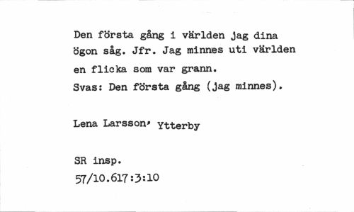 //// Den första gång i världen jag dina ögon såg. Jfr. Jag minnes uti världen //// en flicka som var grann. //// Svass Den första gång (jag minnes). //// Lena Larsson* Ytterby //// SR insp. 57/10.617:3:10 ////