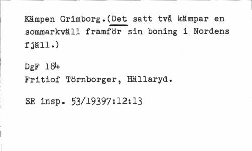//// Kämpen Grimborg.(Det satt två kämpar en sommarkväll framför sin boning i Nordens fjäll.) //// DgF 1$+ //// Fritiof Törnborger, Hällaryd. SR insp. 53/19397:12:13 ////