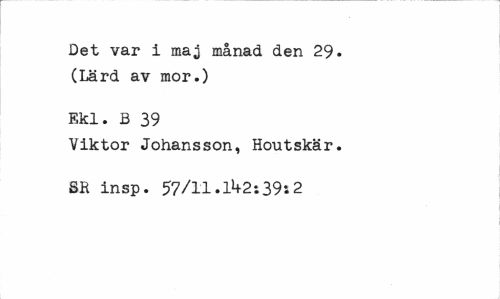 //// Det var i maj månad den 29. (Lärd av mor.) //// Ekl. B 39 //// Viktor Johansson, Houtskär. SR insp. 57/11.1^2:39s2 ////