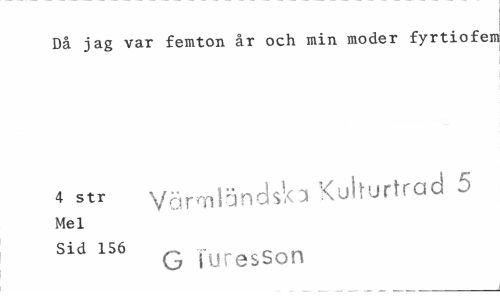 //// Då jag var femton år och min moder fyrtiofel! //// 4 str Värmländska Kulturtrad 5 //// Mel //// Sid 156 „ c-^n //// G iuresSon ////
