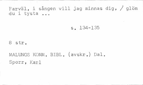 //// Farväl, i sången vill jag minnas dig, / glöm du i tysta .. . //// s. 134-135 //// 8 str. //// MALUNGS KOMM. BIBL. (avskr.) Dal. Sporr, Karl ////