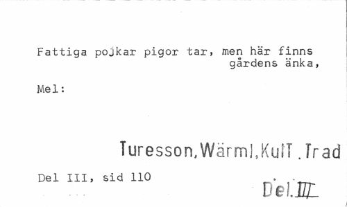 //// Fattiga pojkar pigor tar, men här finns //// gårdens änka, //// Mel: //// Turesson,Wärml.KufT. frad //// Del III, sid 110 - . //// DelJTL ////