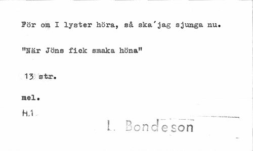 //// För om I lyster höra, så ska'jag sjunga nu. //// "När Jöns fick smaka höna" //// 13 str. mel. //// HA ^ __ ... //// 1 Bondeson ////