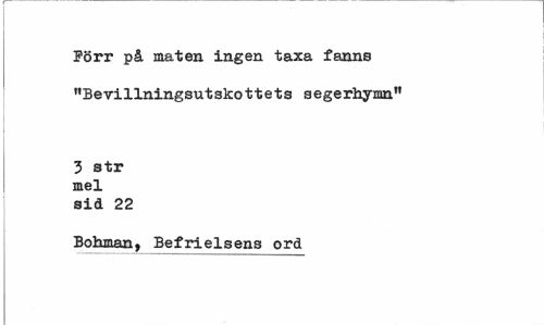 //// Förr på maten ingen taxa fanns "Bevillningsutskottets segerhymn" //// 3 str mel sid 22 //// Bohman, Befrielsens ord ////