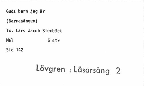 //// Guds barn jag är //// (Barnasången) //// Tx. Lars Jacob Stenbäck //// Mel 5 str //// Sid 142 //// Lövgren : Läsarsång 2 ////