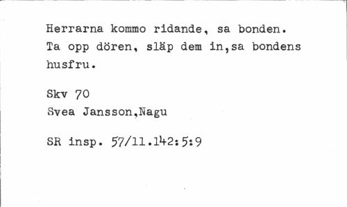 //// Herrarna kommo ridande, sa bonden. Ta opp dören, släp dem in,sa bondens husfru. //// Skv 70 //// Svea Jansson,Nagu SR insp. 57/11.14-2: 5*9 ////