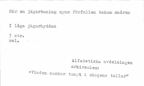 //// Här en jägarboning syns förfallen bakom snåren //// I låga jägarhyddan //// 3 str. mel. //// Alfabetiska avdelningen arkivsalen: "Vinden suckar tungt i skogens tallar" ////