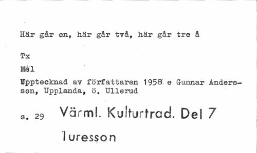 //// Här går en, här går två, här går tre å //// Tx Mél //// Upptecknad av författaren 1958 e Gunnar Andersson, Upplanda, ö. Ullerud //// s< 29 Värml. Kulturtrad. Del 7 I uresson ////