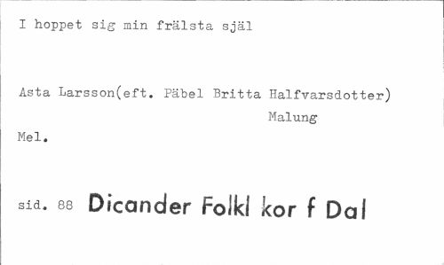 //// I hoppet sig min frälsta själ //// Asta Larsson(eft. Päbel Britta Ilalfvarsdotter) //// Malung //// Mel. //// sid. es Dicander FoJkl kor f Dal ////
