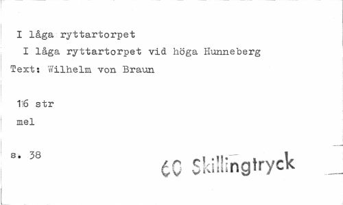 //// I låga ryttartorpet I låga ryttartorpet vid höga Hunneberg Text: Wilhelm von Braun //// 116 str mel //// cC Skiilinglryck _ ////