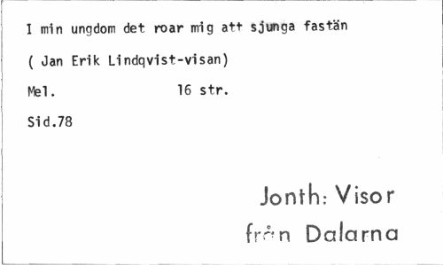 //// I min ungdom det roar mig att sjunga fastän ( Jan Erik Lindqvist-visan) Ntel. 16 str. //// Sid.78 //// Jonth: Visor fr^n Dalarna ////