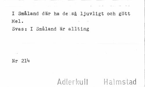 //// I Småland där ha de så ljuvligt och gött Mel. //// Svas; I Småland är allting Nr 211+ //// Adlerku 11 Halmstad ////