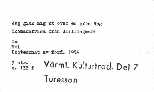//// Jag gick mig ut över en grön äng Skomakarvisa från Skillingmarfc //// Tx Mel //// Upptecknat ar förf. 1959 //// Lljs f Värm!. Ku'tj,trcd. Del 7 Turesson ////