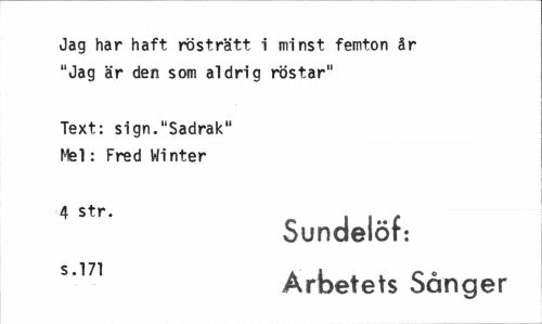 //// Jag har haft rösträtt i minst femton år "Jag är den som aldrig röstar" //// Text: sign."Sadrak" Mel: Fred Winter //// Sundelöf: s'171 Arbetets Sånger ////