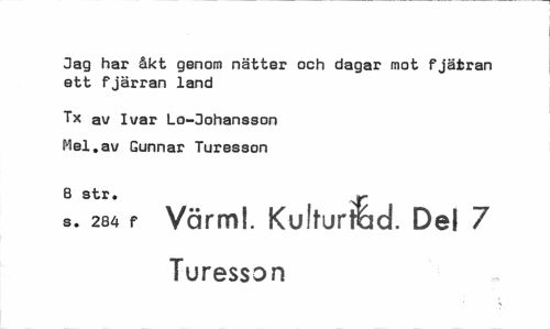 //// Jag har åkt genom nätter och dagar mot fjäfcran ett fjärran land //// Tx av Ivar Lo-Johansson Mel.av Gunnar Turesson //// 8 str. //// s. 284 f Värml. Kulturrad. Del 7 Turesson ////
