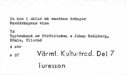 //// Ja kom i uklar mä smedens drängar Smeddrängens visa //// Tx //// Upptecknad av författafcen e Johan Sohlberg, Dömle, Ullerud //// 4 str //// b 97 Värm!. Kulturtrcd. Del 7 furesson ////