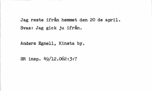 //// Jag reste ifrån hemmet den 20 de april. Svas: Jag gick ju ifrån. //// Anders Egnell, Kinsta by. //// SR insp. 49/12.062:3:7 ////