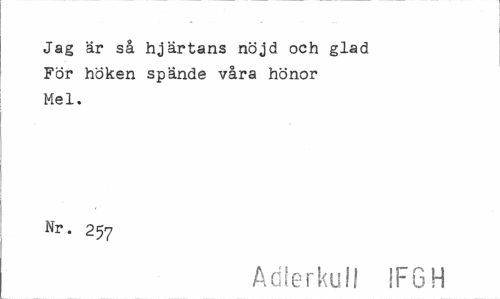 //// Jag är så hjärtans nöjd och glad För höken spände våra hönor Mel. //// Nr. 257 //// Adlerkull IFGH ////