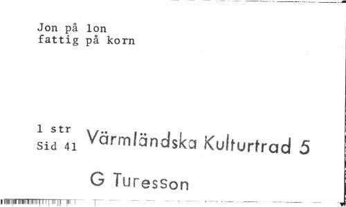 //// Jon på lon fattig på korn //// X s t r //// Sid 41 Värmländska Kulfurfrad 5 G Turesson //// 11IIIIIIII1 llllllllllllllllllll I I I III III INI T~ ////
