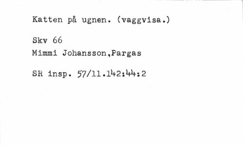 //// Katten på ugnen, (vaggvisa.) Skv 66 //// Mimmi Johansson,Pargas SR insp. 57/ll.ll*2i¥+i2 ////