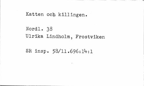 //// Katten ock killingen. Nordl. 38 //// Ulrika Lindholm, Frostviken SR insp. 58/11.696:1>+:1 ////
