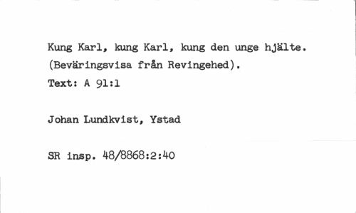 //// Kung Karl, kung Karl, kung den unge hjälte. (Beväringsvisa från Revingehed). Text: A 91:1 //// Johan Lundkvist, Ystad //// SR insp. 48/8868:2:40 ////