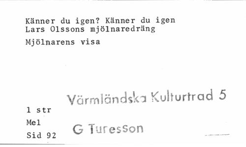 //// Känner du igen? Känner du igen Lars Olssons mjölnaredräng //// Mjölnarens visa //// Värmländska Kulturfrad 5 //// 1 str //// Mel ^ _ //// G fyre^Son //// Sid 92 w 1 *___ ////