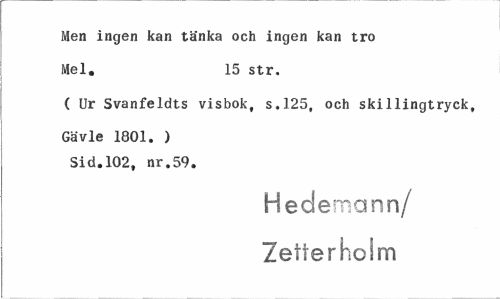 //// Men ingen kan tänka och ingen kan tro Mel. 15 str. //// ( Ur Svanfeldts visbok, s.125, och skillingtryck, //// Gävle 1801. ) Sid.102, nr.59. //// Hedernann/ Zetterholm ////