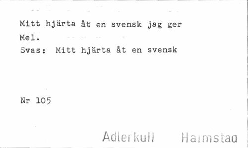 //// Mitt hjärta åt en svensk jag ger Mel. //// Svas: Mitt hjärta åt en svensk Nr 105 //// Adlerkull Halmstad ////