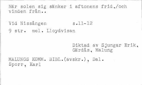 //// När solen sig sänker i aftonens frid,/och vinden från.. //// Vid Nissången s.11-12 //// 9 str. mel. Lloydvisan //// Diktad av Sjungar Erik, Gärdås, Malung //// MALUNGS KOMM. BIBL.(avskr.), Dal. Sporr, Karl ////