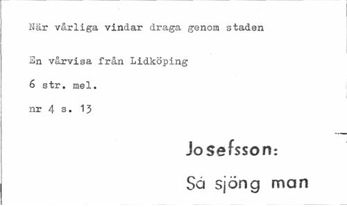 //// När vårliga vindar draga genom staden //// En vårvisa från Lidköping 6 str. mel. nr 4 s• 13 //// Josefsson: //// Sa sjöng man ////