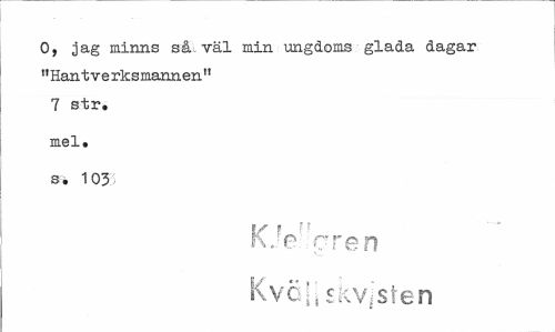 //// O, jag minns så.väl min ungdoms glada dagar "Hantverksmannen" 7 str. //// mel» //// si 103 //// IX t H //// hje c ren Kvöji ckvjsten ////