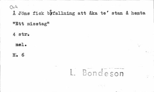 //// Å Jöns fick byfallning att åka te' stan å hemta »Ett misstag" 4 str. //// mel. H. 6 //// L Bondeson ////