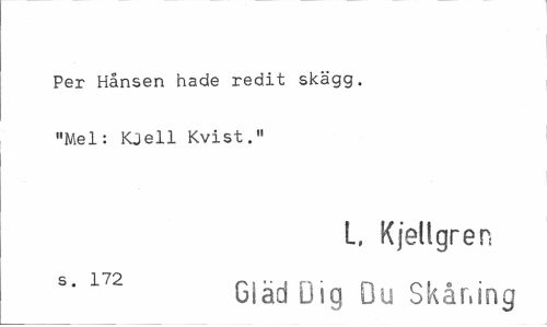 //// Per Hånsen hade redit skägg. "Mel: Kjell Kvist." //// L, Kjellgren //// s' 172 Gläd Dig Du Skåning ////