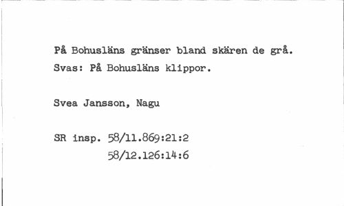 //// På Bohusläns gränser bland skären de grå. Svas: På Bohusläns klippor. //// Svea Jansson, Nagu //// SR insp. 58/11.869:21:2 58/12.126:14:6 ////