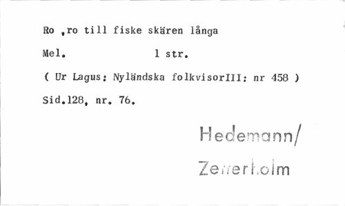 //// Ro ,ro till fiske skären långa Mel. 1 str. //// C Ur Lagus; Nyländska folkvisorlll; nr 458 ) Sid.128, nr. 76. //// H ederna nn/ Zei/erKoim ////