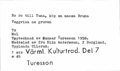 //// Ro ro till Tuna, köp en massa Bruna Vaggvisa om gruvan //// Tx Mel. //// Upptecknad av. § unnar ^uresson 1958.. Meddelad av fru Elin Andersson, f Berglund, Upplanda Ullerud. //// 1 str Värml. Kulturtraa. Del 7 //// s 45 //// Turesson ////