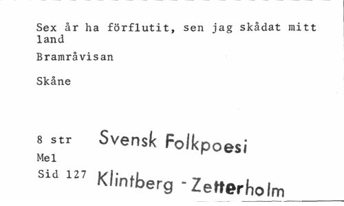 //// Sex år ha förflutit, sen jag skådat mitt land //// Brararåvisan Skåne //// 8 str Svensk Folkpoesi //// Mel //// sld 127 Klintberg - Zetterholm__ ////