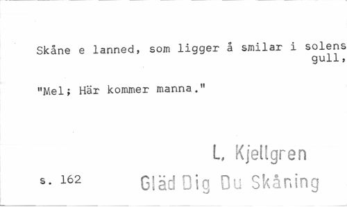 //// Skåne e lanned, so/n ligger å smilar i solen: //// gull //// "Mel; Här kommer manna." //// I, Kjellgren s- 162 Gläd Dig Du Skåning ////