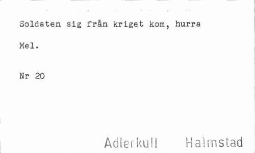 //// Soldaten sig från kriget kora, hurra Mel. //// Nr 20 //// Adierkull Halmstad ////
