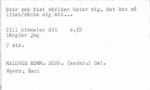 //// Stor sak fast världen hatar mig, det kan så litet/ränta sig att... //// Till himmelen dit s.52 längtar jag //// 7 str. //// MALUNGS KOMM. BIBL. (avskr.) Dal. Sporr, Karl ////