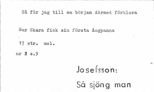 //// Så får jag till en början därmed förklara //// Hur Skara fick sin första ångpanna //// 17 str. mel. nr 2 3.9 //// Josefsson*. Så sjöng man ////