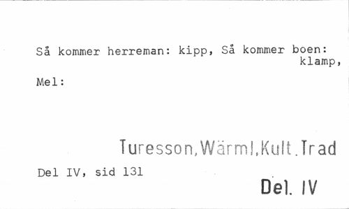 //// Så kommer herreman: kipp, Så kommer boen: //// klamp, //// Mel: //// Turesson,Wärml,Kult.Trad //// Del IV, sid 131 //// Del. IV ////