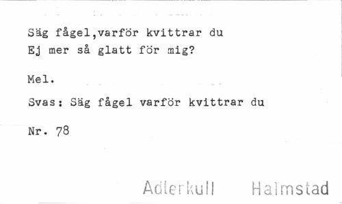 //// Säg fågel,varför kvittrar du Ej mer så glatt för mig? //// Mel. //// Svas: Säg fågel varför kvittrar du Nr. 78 //// Adlerkull Halmstad ////