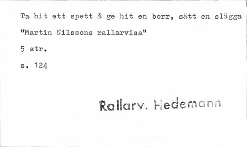 //// Ta hit ett spett å ge hit en borr, sätt en slagga "Martin Nilssons rallarvisa" 5 str. s. 124 //// Rallarv. Hed em ann ////