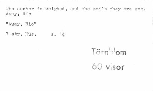 //// The anchor is weighed, and the sails they are set. Away, Rio //// "Away, Rio" //// 7 str. Mus. s. 14 //// T" ' « //// ! 1 om 60 visor ////