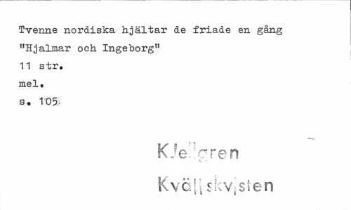//// Tvenne nordiska hjältar de friade en gäng //// "Hjalmar och Ingeborg" //// 11 str. //// mel. //// s. 1 05.-' //// KJe:fcren //// V.:-' //// Kvo[ i skvjsten ////