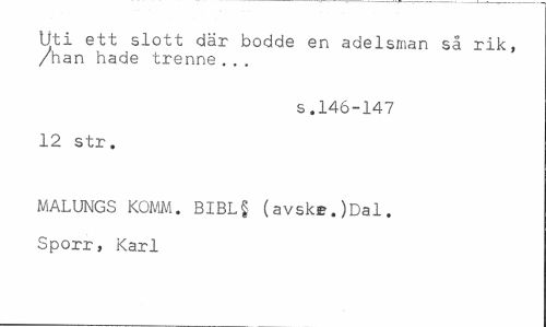 //// Uti ett slott där bodde en adelsman så rik, /han hade trenne... //// s. 146-147 //// 12 str. //// MALUNGS KOMM. BIBL§ (avske.)Dal. Sporr, Karl ////